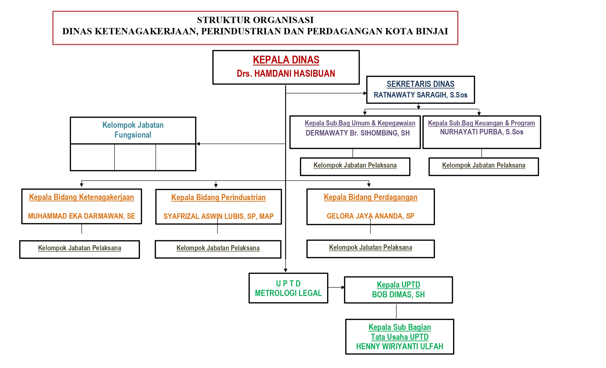 Sesuai dengan Peraturan Daerah Kota Binjai No. 04 Tahun 2016 tentang Organisai Kota Binjai sebagai dasar pembentukan Dinas Tenaga Kerja dan Perindustrian Perdagangan Kota Binjai sebagai unsur penunjang Pemerintah Kota Binjai dibidang tenaga kerja, perindustrian, perdagangan dan pasar, berada dibawah dan bertanggung jawab kepada Walikota Binjai melalui Sekretaris Daerah Kota Binjai, Peraturan Wali Kota Binjai No. 35 Tahun 2016 tentang Tugas, Fungsi dan Tata Kerja Dinas Tenaga Kerja dan Perindustrian Perdagangan Kota Binjai, Peraturan Wali Kota Binjai No. 29 Tahun 2017 tentang Perubahan atas Peraturan Wali Kota Binjai No. 35 Tahun 2016 tentang Tugas, Fungsi dan Tata Kerja Dinas Tenaga Kerja dan Perindustrian Perdagangan Kota Binjai, Peraturan Wali Kota Binjai No. 9 Tahun 2018 tentang Pembentukan UPTD Metrologi Legal Pada Dinas Tenaga Kerja dan Perindustrian Perdagangan Kota Binjai, Peraturan Wali Kota Binjai No. 35 Tahun 2018 tentang Perubahan Kedua atas Peraturan Wali Kota Binjai No 25 Tahun 2016 tentang Kedudukan dan Susunan Organisasi Perangkat Daerah, dan Peraturan Walikota Binjai No. 37 Tahun 2018 tentang Perubahan Kedua atas Peraturan Wali Kota Binjai No. 35 Tahun 2016 tentang Tugas, Fungsi dan Tata Kerja Dinas Tenaga Kerja dan Perindustrian Perdagangan Kota Binjai, Peraturan Daerah Kota Binjai No. 1 Tahun 2023 tentang Perubahan Atas Peraturan Daerah No. 4 Tahun 2016 Tentang Pembentukan Perangkat Daerah Kota Binjai yang merubah nomenklatur Dinas Tenaga Kerja dan Perindustrian Perdagangan Kota Binjai menjadi Dinas Ketenagakerjaan, Perindustrian dan Perdagangan Kota Binjai, dan Peraturan Daerah Kota Binjai No. 17 Tahun 2023 tentang Susunan Organisasi, Kedudukan, Tugas Dan Fungsi dan Tata Kerja Perangkat Daerah yang merubah struktur organisasi Disnaker Perindag.